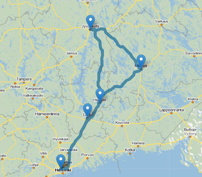 Helsinki (Ruosilankuja 4) - Lahti - Heinola - Jyväskylä - Mikkeli - Helsinki