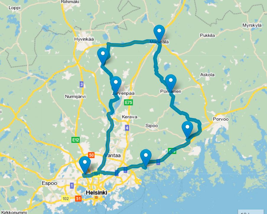 Helsinki (Ruosilankuja 4) - Vantaa - Kerava - Järvenpää - Mäntsälä - Pornainen -  Porvoo - Helsinki