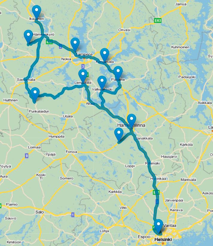 Helsinki (Ruosilankuja 4)  – Renko – Hämeenlinna – Lempäälä – Sastamala – Ikaalinen – Hämeenkyrö – Tampere – Kangasala – Pälkäne – Valkeakoski – Helsinki